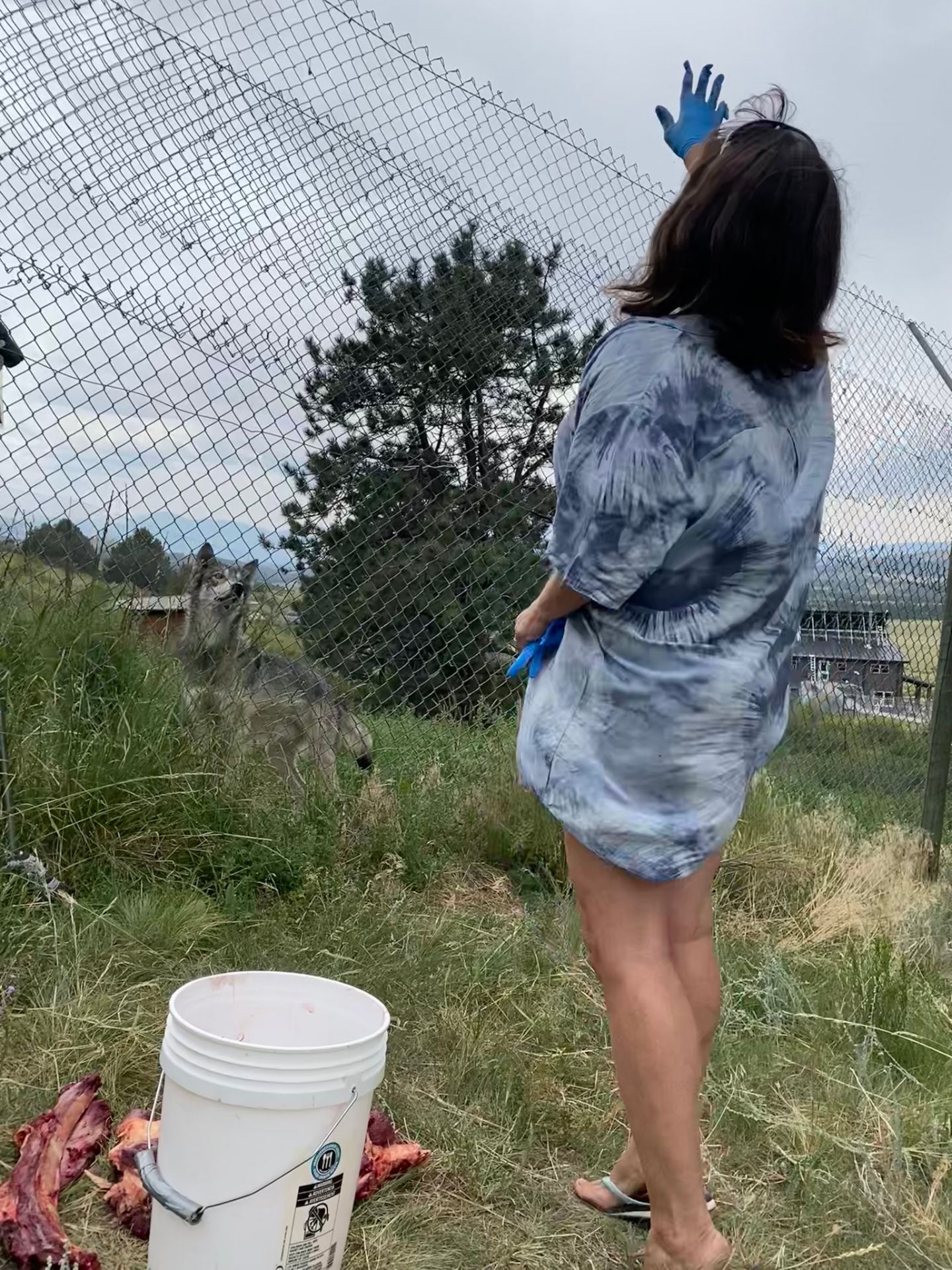 Vlci dostanou maso, vnitřnosti, kosti i kůži. Házíme jim to přes plot. Chytají maso v letu a rovnou je spolknou. Nejdřív tzv. pill pocket – krásný kousek masa, ve kterém se udělá nožem kapsa a vloží se tam potravinové doplňky.