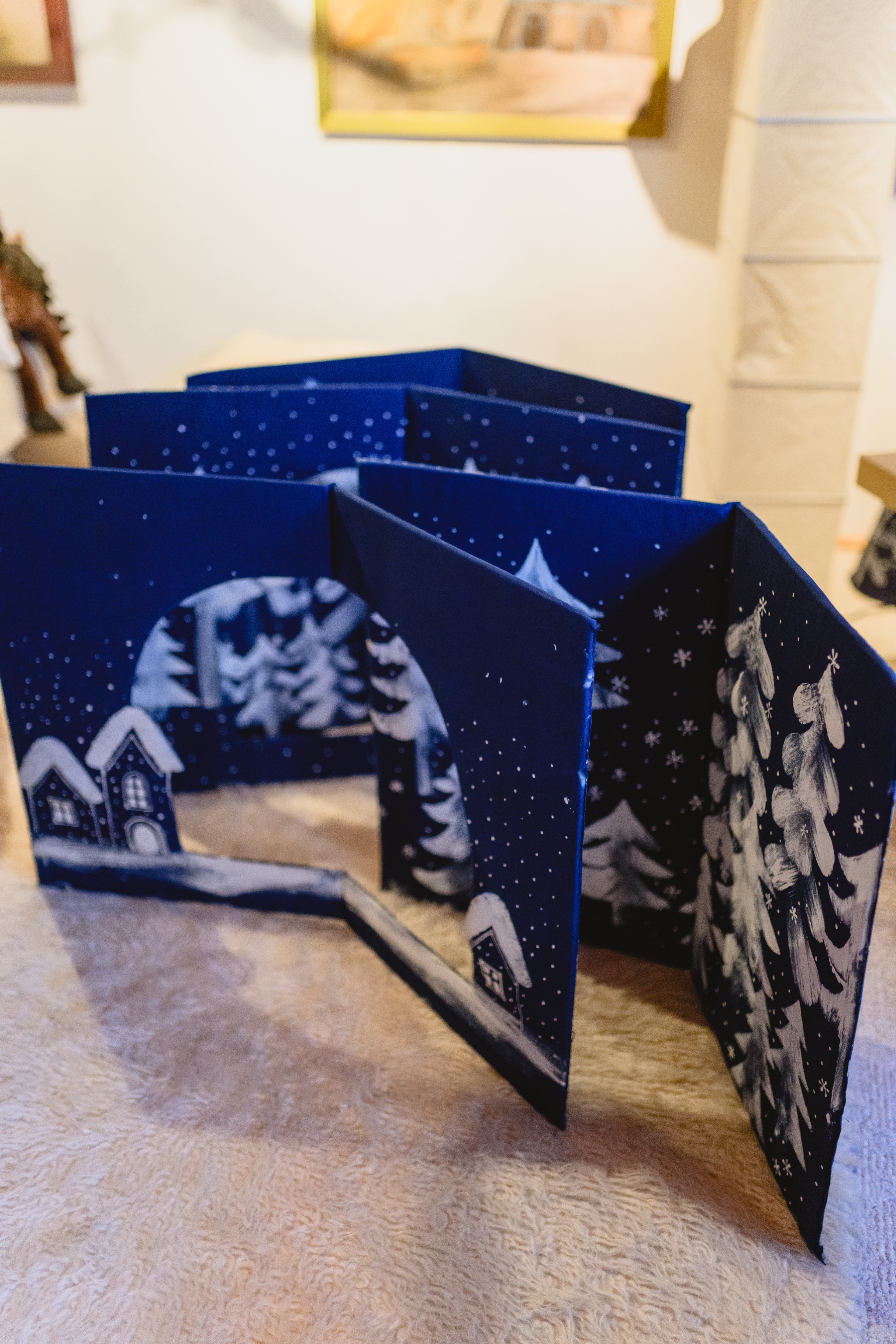 Výroba kulis je stále její velkou radostí. „V Betlémské kapli v Praze bývají každý rok přes Vánoce vystaveny betlémy, které vždy mívají nějaké téma. Jednou chtěli něco z netradičních materiálů, tak jsem udělala modrotiskový betlém. Je to vlastně takové divadélko, kulisa v lese, do toho jesličky, Maria, Josef, Ježíšek, pastýři, koledníci, ovečky,“ ukazuje na velké díly lesa i jednotlivé figurky, které má složeny pod oknem v pracovně.