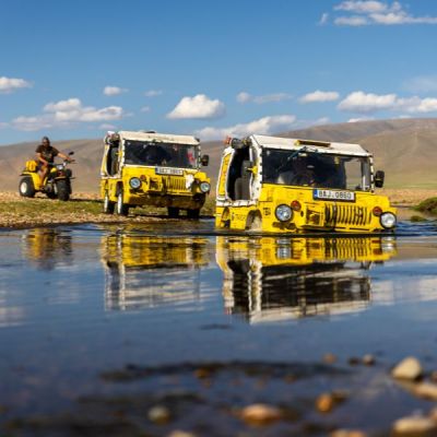Přednáška o nejnovější výpravě žlutého cirkusu do Mongolska, tentokrát plovoucím autem.