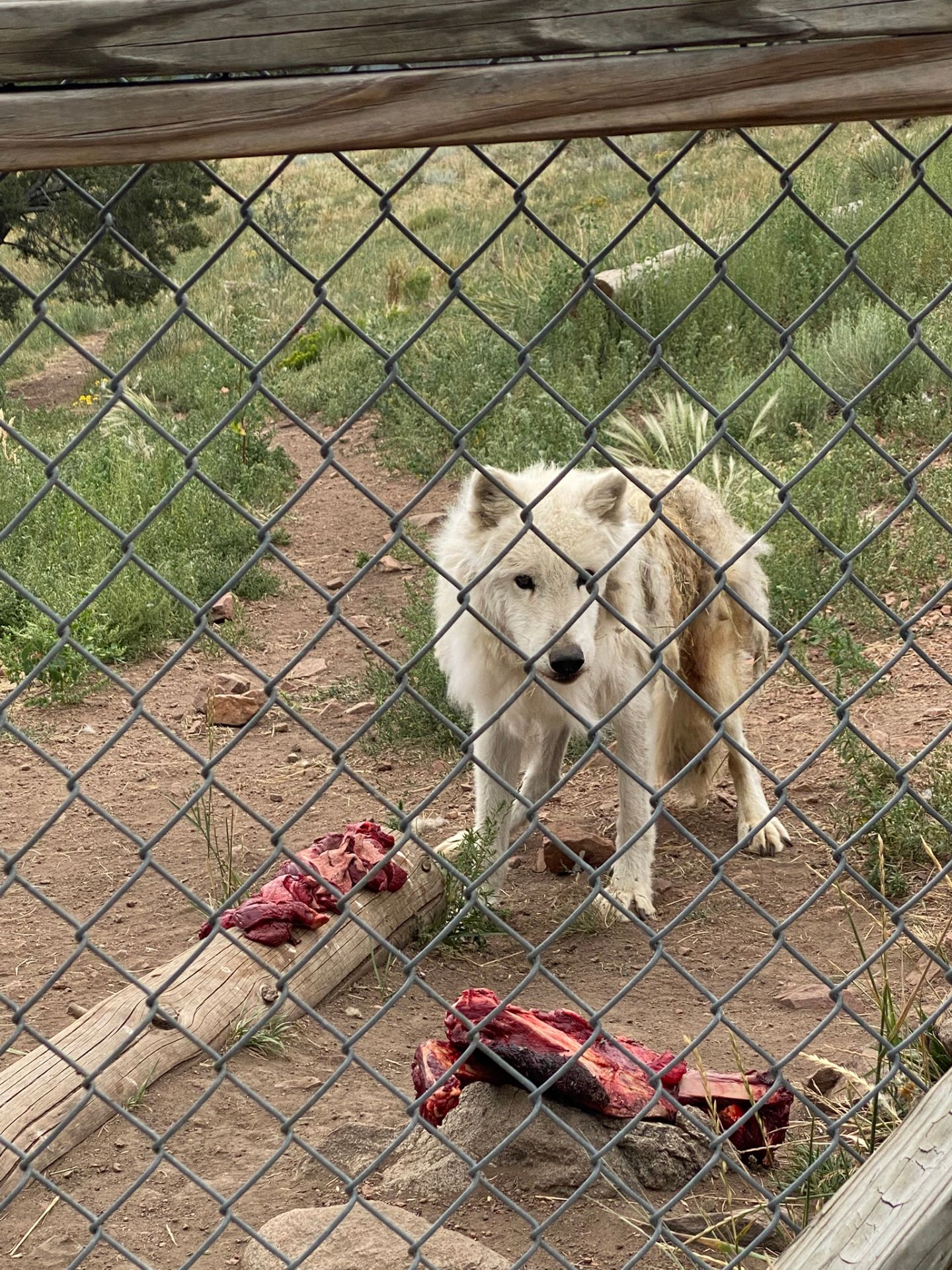 Vlci dostanou maso, vnitřnosti, kosti i kůži. Házíme jim to přes plot. Chytají maso v letu a rovnou je spolknou. Nejdřív tzv. pill pocket – krásný kousek masa, ve kterém se udělá nožem kapsa a vloží se tam potravinové doplňky.