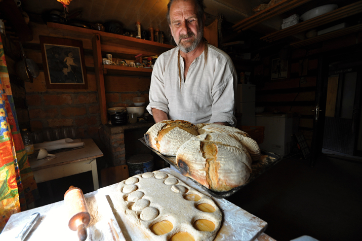 Chleba se naučil péct doslova rukama. „V troubě v chalupě nemám termostat. Takže mé pečení je o dotycích v peci. Teď už mně stačí, abych vložil ruku do trouby, a už vím. Mám to dobře rozpálené, můžu sázet chleba…“