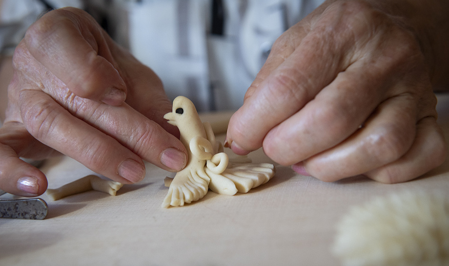 Jedna figurka se vyrábí zhruba pět minut. Některé holubičky a sluníčka jsou ale časově náročnější. „Oči dělám po vzoru maminky a babičky z koukolu nebo hrachoru. Dřív se dávala hořčičná semínka. Jsou ale kulatá a malá a stávalo se, že z těsta vypadávala. Má se zkrátka používat to, co roste v naší přírodě, klidně třeba pepř.“